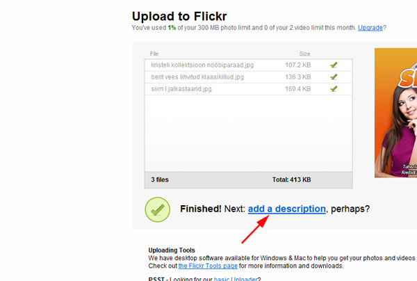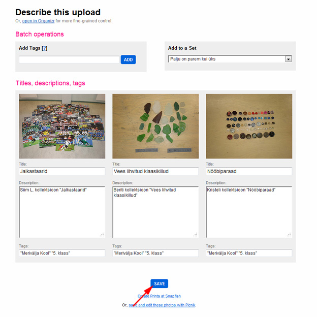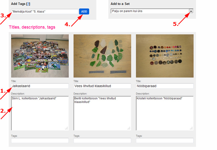 (Näit: "Kukesupi Põhikool" "6. klass"). Vajutades nüüd Add nuppu (pildil nooleke nr 4), lisatakse need märksõnad kõikidele piltidele mille oled üles laadinud. Nii saab näiteks kogu klassi pildid korraga üles laadida ja märksõnadega varustada.