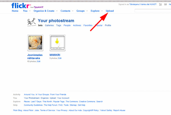 1. Piltide üles laadimine käib Flickr.com lehelt.Kliki linki: http://www.flickr.com/photos/67749715@N07/sets/