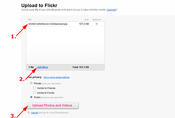 Kui soovid veel pilte laadida, vajuta nuppu Add more (pildil nooleke nr 2).